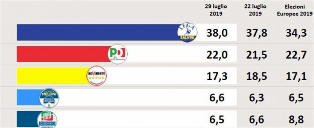 Rispetto alle Europee (34,3), la Lega è assestata al 38 per cento, lo 0,2 per cento in più rispetto a una settimana fa.
