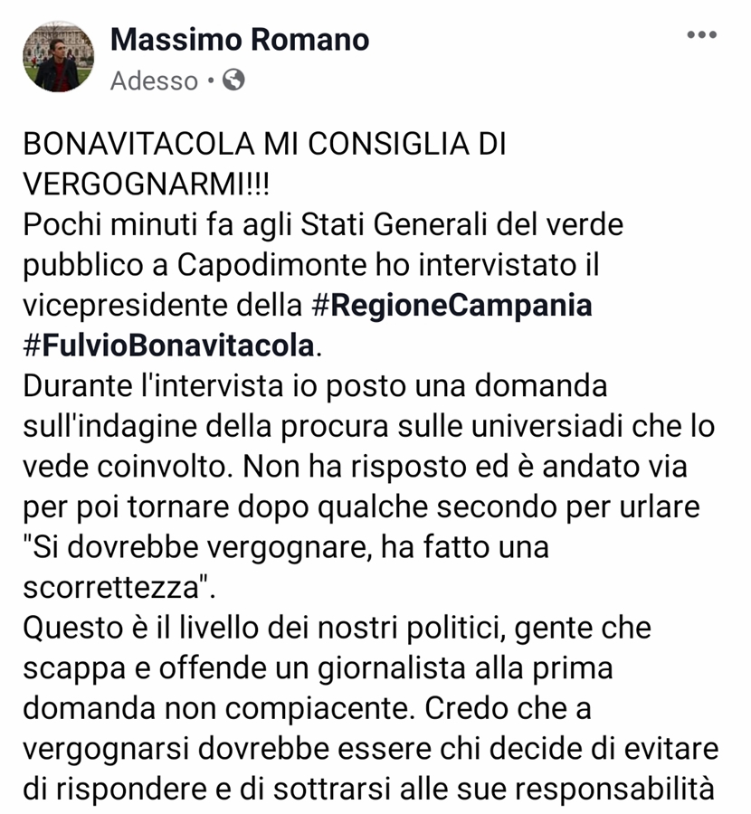 Accade che nel corso di una conferenza stampa, sugli Stati Generali del verde pubblico a Capodimonte, un cronista che fa solo il proprio lavoro come Massimo Romano, professionista serio e scrupoloso, rivolge una domanda a Bonavitacola per conoscere il suo commento sulla recente inchiesta della Procura di Napoli sulle Universiade dove tra gli indagati ci sarebbe anche il suo nome, è accade il putiferio.