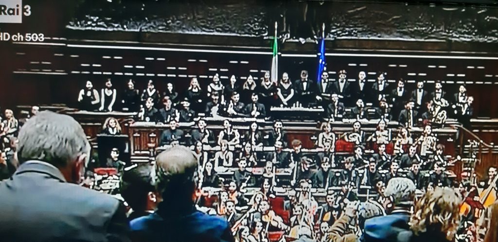Tra i banchi della politica risuonano le note dell’Inno di Mameli, a cui segue un’inedita Improvvisazione per orchestra e successivamente Here’s to You di Ennio Morricone, colonna sonora del film “Sacco e Vanzetti” (1971), sotto la la guida attenta, tenace e visionaria del M° Gaetano Russo.
