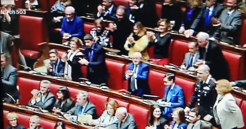 Chiude l’Inno alla Gioia di Beethoveen, compositore di cui si celebreranno nel 2020 i 250 anni dalla nascita. L’Aula ascolta in piedi, in religioso silenzio e rapita dall’emozione, l’Inno alla Gioia, ultimo movimento delle Sinfonia n. 9 composto nel 1824 da Ludwing van Beethoven e oggi inno ufficiale dell’Unione Europa e del Consiglio d’Europa che lo adottò nel 1972.
