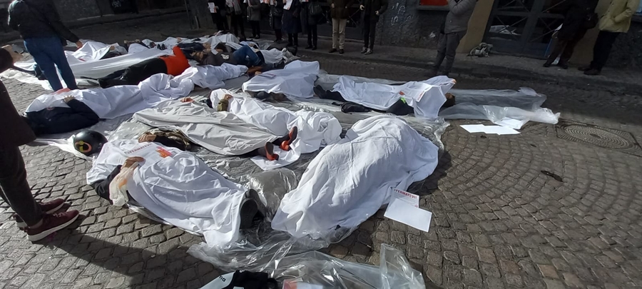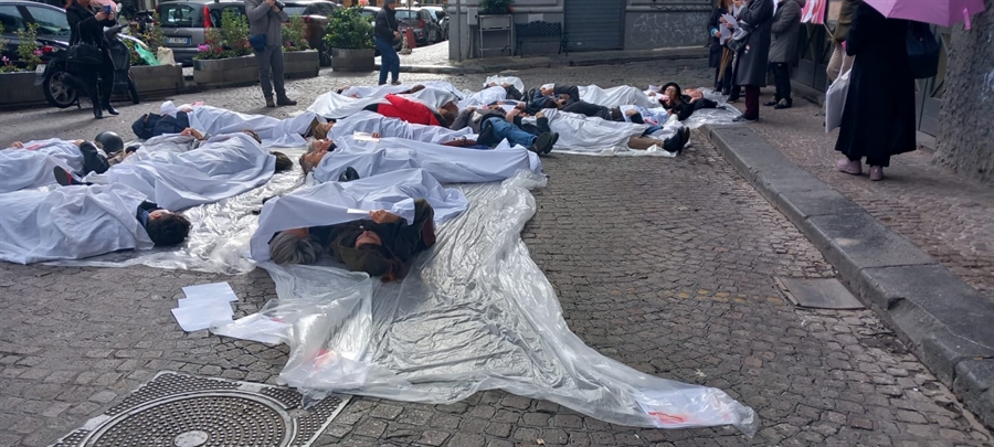 Stesi e avvolti simbolicamente da lenzuoli per opporsi all’orrore della guerra, con un solo imperativo: Fermatevi. Stamane nello spazio antistante il teatro Trianon Viviani in piazza Calenda a pochi metri dal rione Forcella è andato in scena uno speciale Flash mob per protestare, nella giornata internazionale per l’eliminazione della violenza contro le donne, contro tutte le guerre.