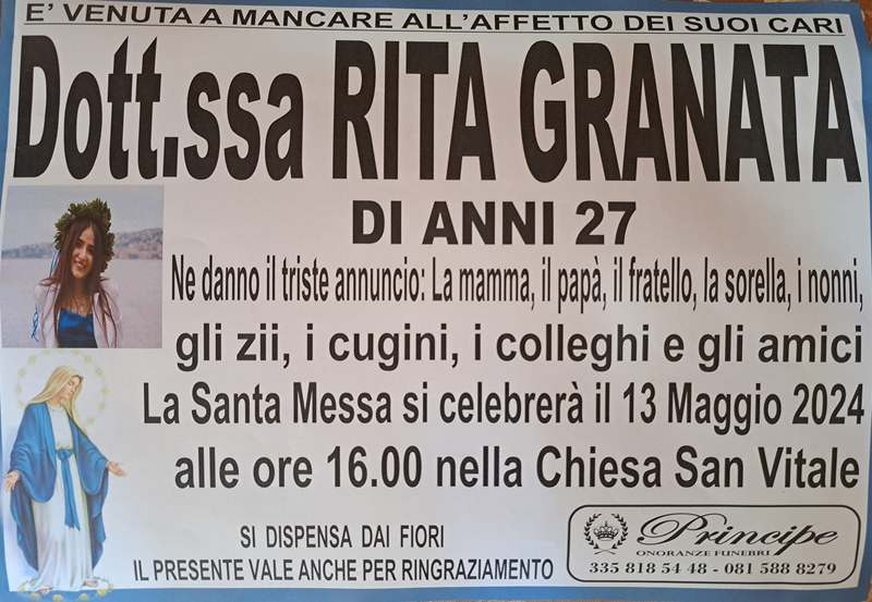 Alle ore 16 di oggi lunedì 13 maggio nella chiesa di San Vitale a Fuorigrotta, si terranno i funerali per dare l’ultimo saluto a Rita Granata, la 27enne investita da un’automobile alle 4 del mattino di domenica, 5 maggio mentre tornava a casa.