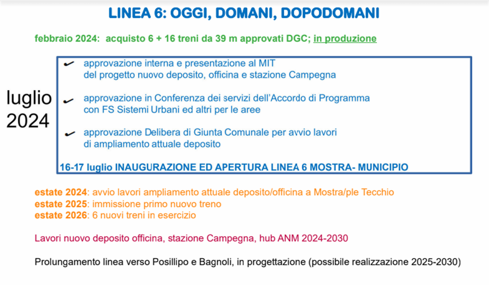 Sarà inoltre realizzata una nuova stazione della metropolitana, “Campegna”, che consentirà di raggiungere con il trasporto metropolitano il quartiere Bagnoli, parte occidentale della città. La Linea 6 è lunga circa 6 km e conta 8 stazioni complessive (Mostra, Augusto, Lala, Mergellina, Arco Mirelli, San Pasquale, Chiaia, Municipio) di cui 4 completamente nuove (Arco Mirelli, San Pasquale, Chiaia, Municipio Linea 6), che collegheranno la Mostra D’Oltremare di Napoli a Piazza Municipio in soli 13 minuti, rispetto ai circa 20 minuti di percorrenza media in auto. Attraverserà il quartiere di Fuorigrotta e la Riviera di Chiaia, consentendo la comoda fruizione del lungomare e di zone centrali della città, e permettendo anche un notevole risparmio in termini di emissioni di Co2.