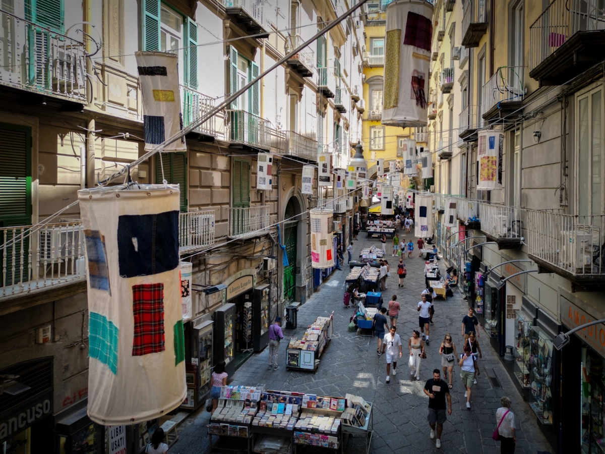 L’installazione di Marras, che fin dal titolo omaggia la cultura partenopea evocando la commedia ‘Questi fantasmi’ di Eduardo De Filippo, ha una precisa valenza civile: valorizzare, attraverso il colore e la fantasia, il centro antico della città. Un’azione di rigenerazione urbana attraverso l’arte che, anche grazie alla collaborazione dell’associazione culturale Port’Alba, mira a valorizzare la storica via dei librai, cuore letterario della città.