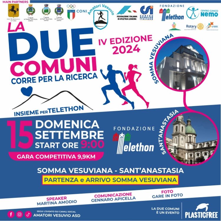 I Comuni di Somma Vesuviana e Sant’Anastasia insieme per Telethon in una maratona podistica all’insegna dell’impegno e della solidarietà a favore della ricerca sulle malattie rare, che si terrà domenica 15 settembre 2024 e che vedrà la partecipazione di oltre 500 atleti per una gara su un percorso di 10 chilometri, inserita nei calendari regionali Fidal. Nella stessa giornata e sempre all’insegna della solidarietà sarà organizzata una passeggiata amatoriale di 3 chilometri, aperta a tutti. Testimonial della manifestazione l’attore Francesco Paolantoni.