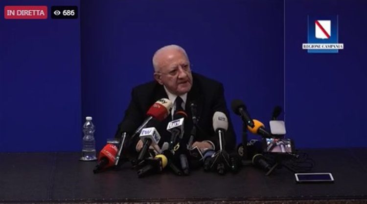 Nella sala De Santis di Palazzo Santa Lucia rimbomba solo la voce del Governatore della Campania. Il volto è teso, le mascelle serrate, il tono della voce è battagliero. La tensione è forte. Chi pensava o immaginava un De Luca che uscisse di colpo di scena, non conosce bene l’ex sindaco di Salerno.