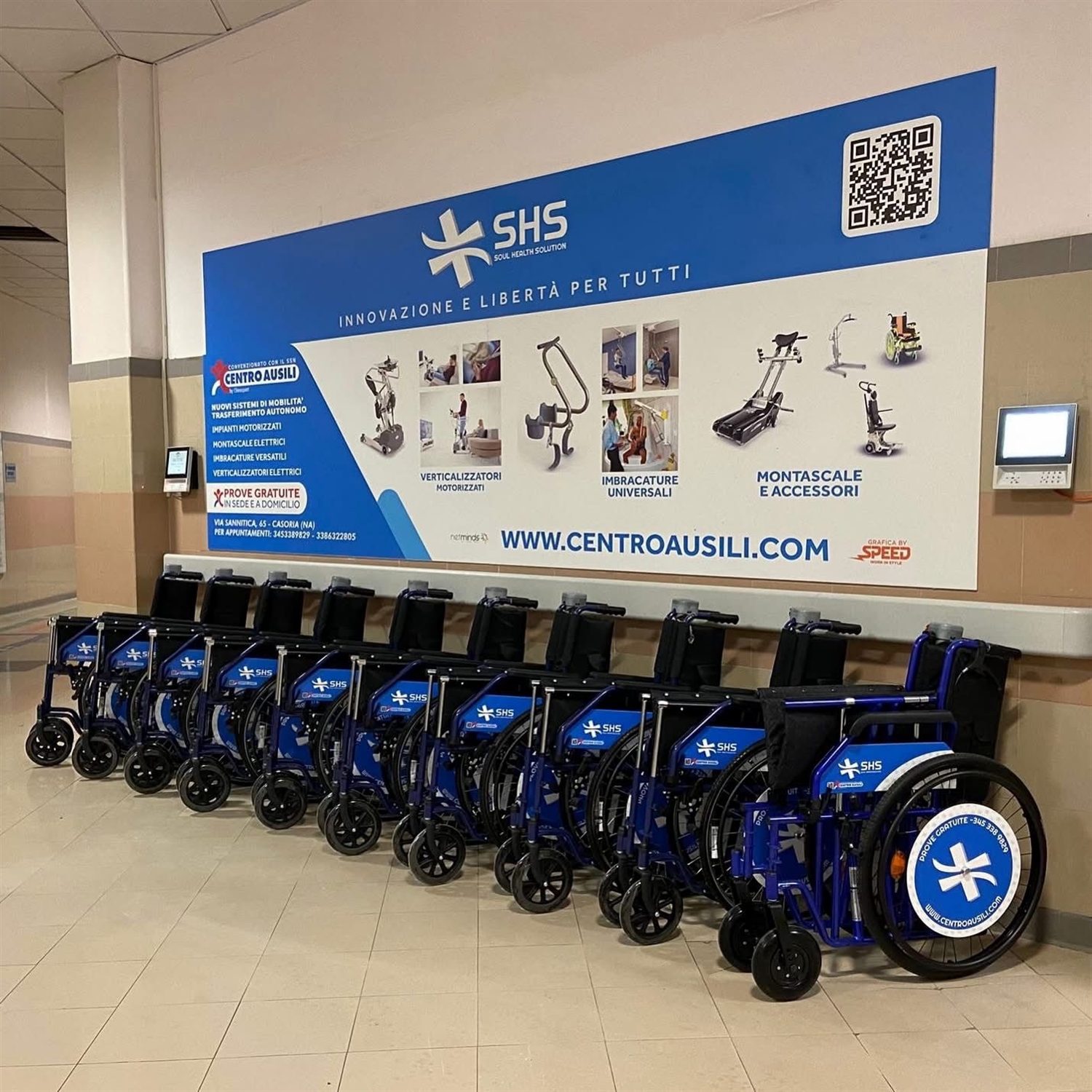 L’Azienda Ospedaliera dei Colli ha promosso una manifestazione di interessi finalizzata alla sponsorizzazione tecnica di un servizio di noleggio a titolo gratuito di sedie a rotelle a cui ha aderito la Soul Health Solution, azienda attiva nel settore delle forniture medico-ospedaliere che ha messo a disposizione dei pazienti sedie a rotelle condivise e facilmente fruibili grazie all’installazione di una segnaletica dedicata.
