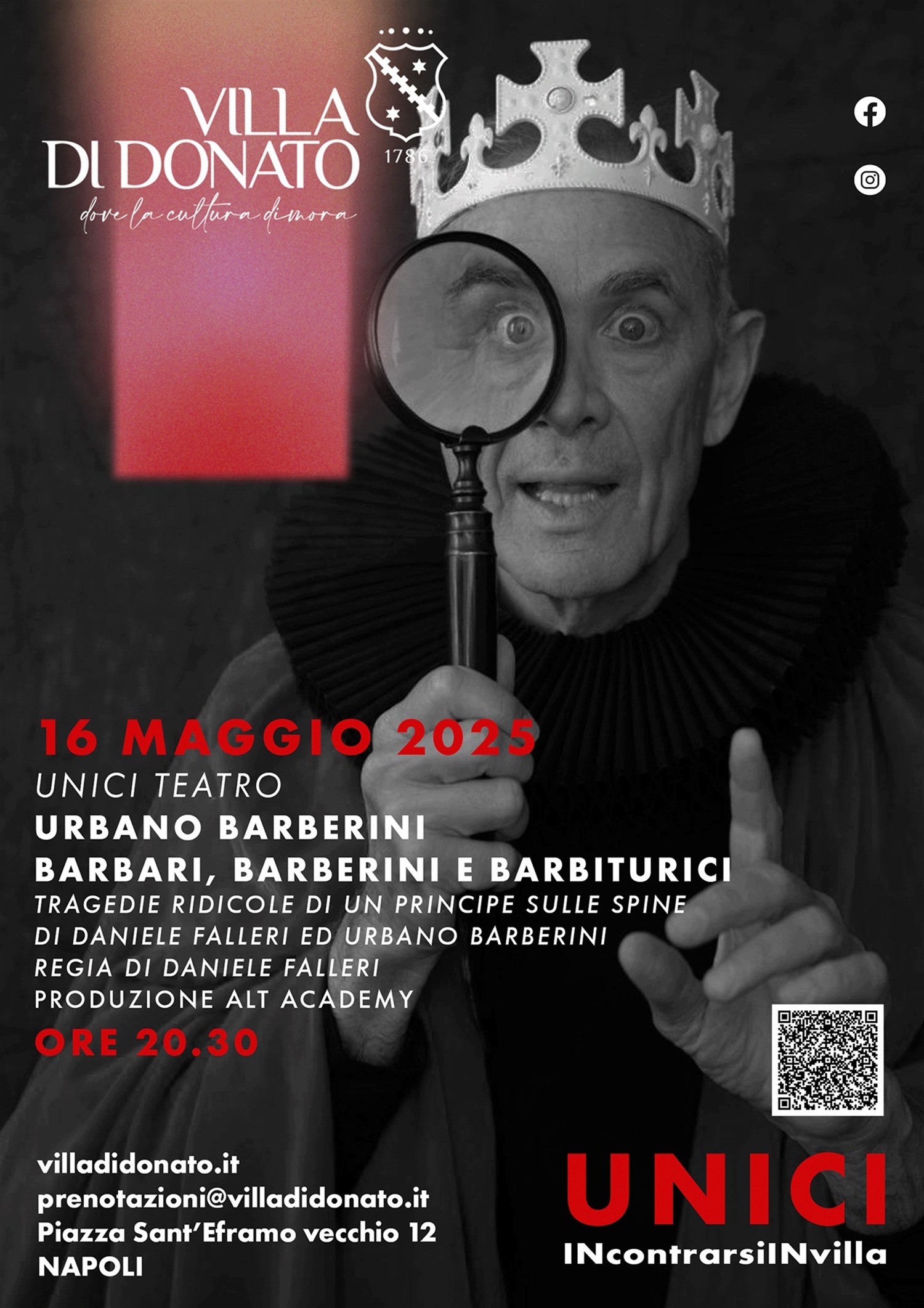 “Quello che non distrussero i barbari lo distrussero i Barberini”. Divertente, irriverente, autoironico: Urbano Barberini sceglie Villa di Donato per la tappa napoletana del suo nuovo spettacolo, Barbari, Barberini e barbiturici. Tragedie ridicole di un Principe sulle spine. L’appuntamento è per venerdì 16 maggio alle ore 20.30, per il one-man-show del principe-attore, erede di una delle più importanti famiglie aristocratiche d’Europa, che vanta nel suo “curriculum” ben quattro Papi.