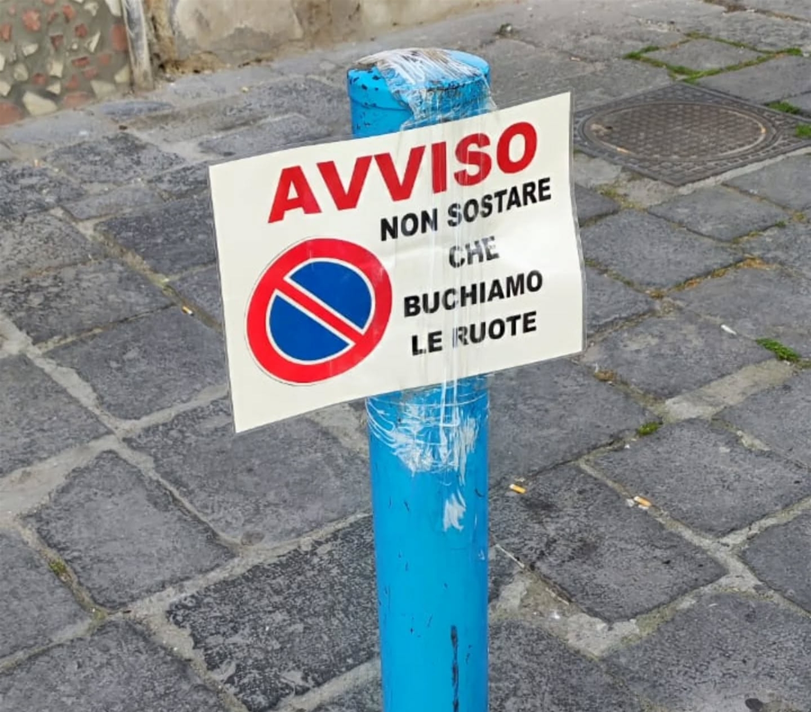 Per evitare fraintendimenti, distrazioni, chi abita al Borgo Sant’Antonio Abate, borgo popolare di Napoli non molto distante dalla Stazione centrale, ha issato un cartello ‘fai da te’ dove c’è scritto: “Avviso. Non sostare che buchiamo le ruote”.
