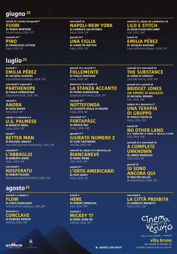 La kermesse porta il Cinema all’aperto fino al 6 agosto. Da “Parthenope” di Paolo Sorrentino a “U.S. Palmese” dei Manetti Bros, da “Follemente” di Paolo Genovese a “Una terapia di gruppo” di Paolo Costella. Tanti i titoli stranieri come “Anora” di Sean Baker, “Better man” di Micheal Gracey, “La stanza accanto” di Pedro Almodovar, “Biancaneve” di Marc Webb, “A complete unknown” di James Mangold. Programma completo su Facebook e Instagram di Arci Movie e sul sito www.arcimovie.it.